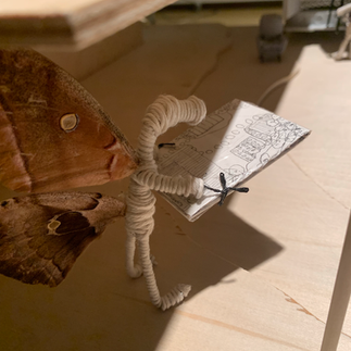 The model depicts a property with a three-story house, a back deck, a large hoop house, and a moving van. The back of the house and deck face the yard, but the front is open to view the interior layout. The top of the hoop house is rolled back, so viewers can see the raised garden beds, one-gallon pots, plug trays, and gardening supplies inside. A collection of little freaks are positioned around the home. These freaks are made out of wire, yarn wrapping, fabric scraps, metal hardware, small animal skulls, and collected bug parts. These freaks are based on the people I hope to meet and keep in my future. The property is decorated with wooden dowels to represent trees and wild growth, but designed and planted gardens are made out of dried and pressed flowers. This all rests on layered birch plywood cut to 4’x2’.